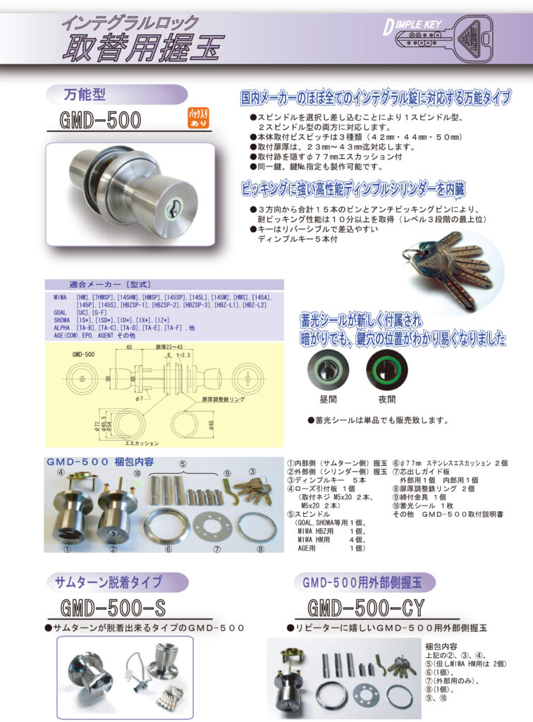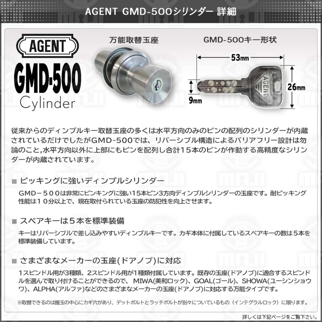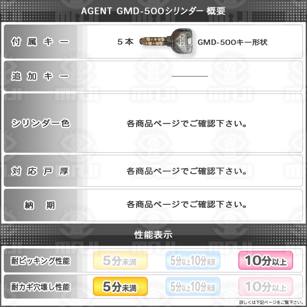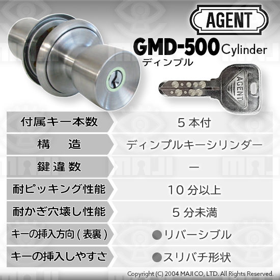 AGENT (エージェント)GMD500 概要 2024 7/22 AGENT(エージェント、大国製作所) AGENT(エージェント、大国製作所) 各種シリンダー概要 目次AGENT (エージェント)GMD500シリンダー 概要 付属キー本数5本付き構造ディンプルキーシリンダー鍵違数–耐ピッキング性能10分以上耐かぎ穴壊し性能5分未満キーの挿入方向(表裏)●リバーシブルキーの挿入しやすさ●スリバチ形状 AGENT(エージェント、大国製作所) AGENT(エージェント、大国製作所) 各種シリンダー概要 AGENT GMD500 シリンダー ディンプルキー