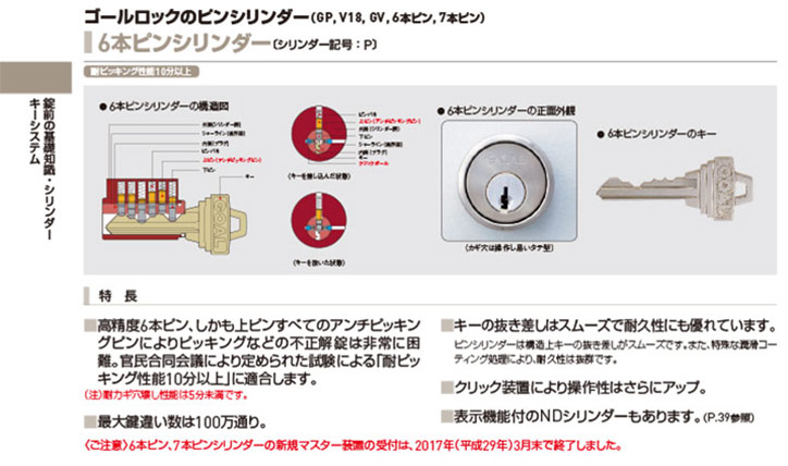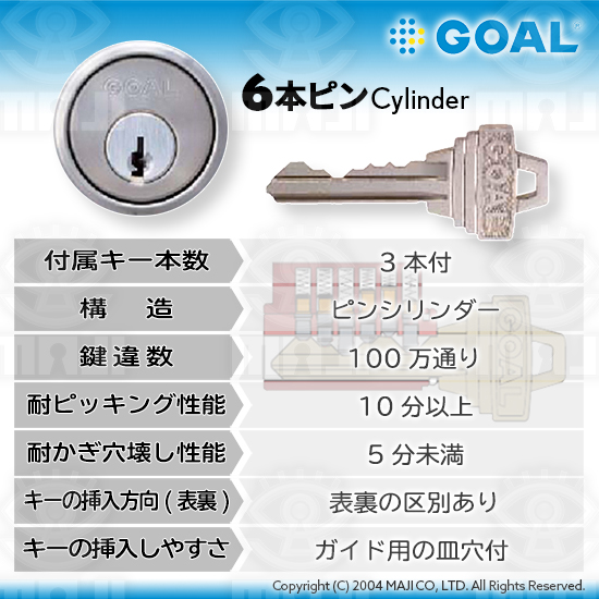 GOAL(ゴール)6本ピンシリンダー 概要 2024 7/22 GOAL(ゴール) GOAL(ゴール) 各種シリンダー概要 目次6本ピンシリンダー 概要 付属キー本数3本付き構造ピンシリンダー鍵違数約100万通り耐ピッキング性能10分以上耐かぎ穴壊し性能5分未満キーの挿入方向(表裏)表裏ありキーの挿入しやすさガイド用の皿穴付き GOAL(ゴール) GOAL(ゴール) 各種シリンダー概要 6ピン 6ピンシリンダー 6本ピン 6本ピンシリンダー GOAL ゴール シリンダー