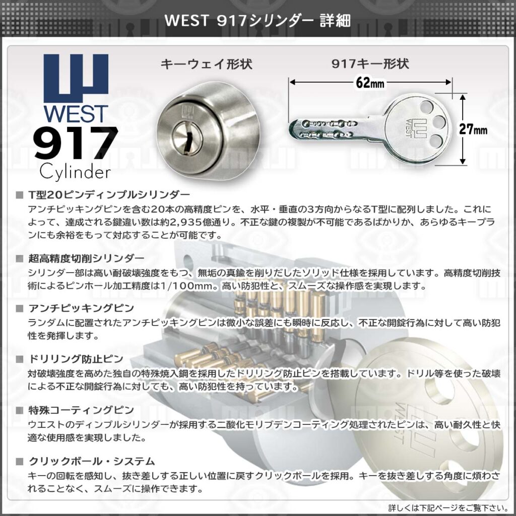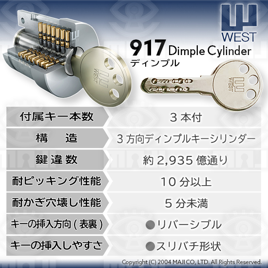 WEST(ウエスト)917ディンプルシリンダー 概要 2024 7/22 WEST(ウエスト) WEST(ウエスト) 各種シリンダー概要 目次WEST 917ディンプルシリンダー 概要 付属キー本数3本付き構造3方向ディンプルキーシリンダー鍵違数約2,935億通り耐ピッキング性能10分以上耐かぎ穴壊し性能5分未満キーの挿入方向(表裏)●リバーシブルキーの挿入しやすさ●スリバチ形状 WEST(ウエスト) WEST(ウエスト) 各種シリンダー概要 917 WEST ウェスト シリンダー ディンプルキー