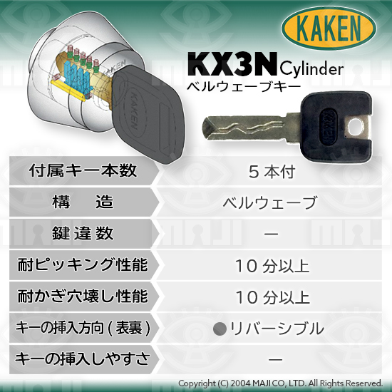 KAKEN(家研販売) KX3Nシリンダー 概要 2024 7/22 KAKEN(家研販売所) KAKEN(家研販売)各種シリンダー概要 目次KX3Nシリンダー 概要 付属キー本数5本付き構造ベルウェーブ鍵違数–耐ピッキング性能10分以上耐かぎ穴壊し性能10分以上キーの挿入方向(表裏)●リバーシブルキーの挿入しやすさ– KAKEN(家研販売所) KAKEN(家研販売)各種シリンダー概要 KAKEN KX3N シリンダー ベルウェーブキー 家研販売