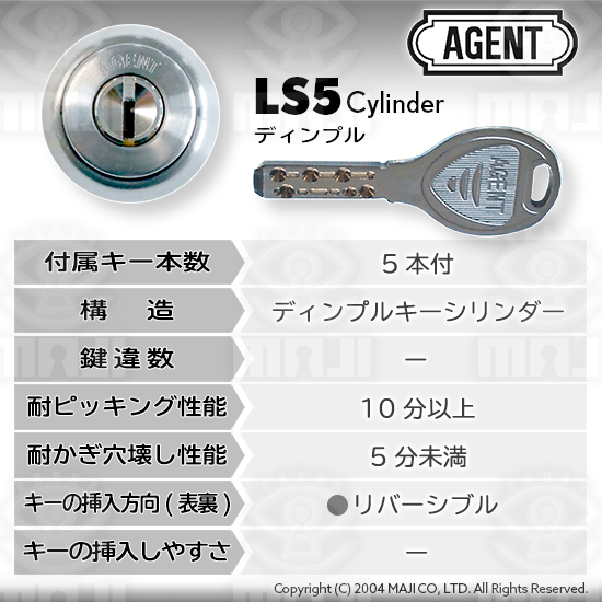 AGENT(エージェント、大国製作所) LS5シリンダー 概要 2024 7/22 AGENT(エージェント、大国製作所) AGENT(エージェント、大国製作所) 各種シリンダー概要 目次LS5シリンダー 概要 付属キー本数5本付き構造ディンプルキーシリンダー鍵違数–耐ピッキング性能10分以上耐かぎ穴壊し性能5分未満キーの挿入方向(表裏)●リバーシブルキーの挿入しやすさ– AGENT(エージェント、大国製作所) AGENT(エージェント、大国製作所) 各種シリンダー概要 AGENT LS5 エージェント シリンダー ディンプルキー
