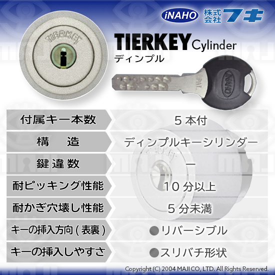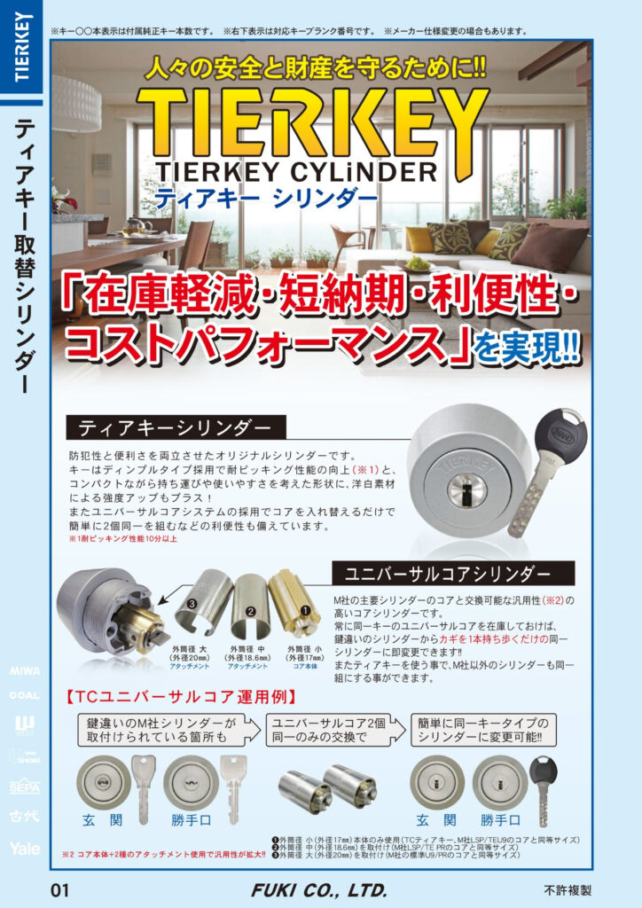 FUKI(フキ、イナホ) TIERKEYシリンダー 概要 2024 7/24 FUKI(フキ,イナホ) FUKI(フキ,イナホ)各種シリンダー概要 TIERKEYシリンダー 概要 付属キー本数5本付き構造ディンプルキーシリンダー鍵違数–耐ピッキング性能10分以上耐かぎ穴壊し性能5分未満キーの挿入方向(表裏)●リバーシブルキーの挿入しやすさ●スリバチ形状 FUKI(フキ,イナホ) FUKI(フキ,イナホ)各種シリンダー概要 FUKI TIERKEY シリンダー ティアキー ディンプルキー フキ