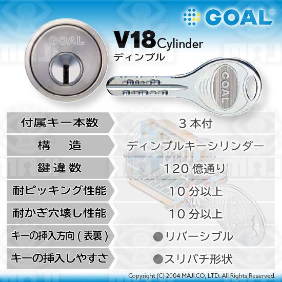 GOAL(ゴール)V18シリンダー 概要 2024 7/24 GOAL(ゴール) GOAL(ゴール) 各種シリンダー概要 V18シリンダー 概要 付属キー本数3本付き構造ディンプルキーシリンダー鍵違数約120億通り耐ピッキング性能10分以上耐かぎ穴壊し性能10分以上キーの挿入方向(表裏)●リバーシブルキーの挿入しやすさ●スリバチ形状 GOAL(ゴール) GOAL(ゴール) 各種シリンダー概要 GOAL V18 V18シリンダー ゴール シリンダー ディンプルキー
