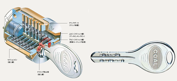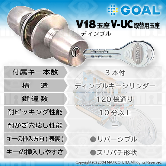 GOAL(ゴール)V-UC取替用玉座 概要 2024 7/22 GOAL(ゴール) 各種シリンダー概要 目次GOAL(ゴール)V18シリンダー(V-UC取替用玉座) 概要 付属キー本数3本付き構造ディンプルキーシリンダー鍵違数120億通り耐ピッキング性能10分以上耐かぎ穴壊し性能–キーの挿入方向(表裏)●リバーシブルキーの挿入しやすさ●スリバチ形状 GOAL(ゴール) 各種シリンダー概要 GOAL V-UC V18 ゴール シリンダー ディンプルキー 万能玉座