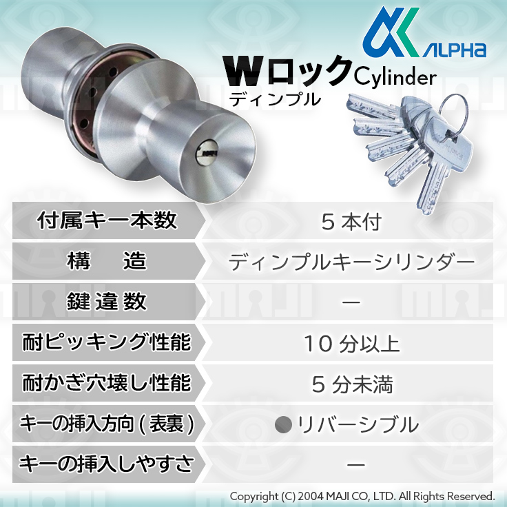 ALPHA(アルファ)Wロック(ディンプル)シリンダー 概要 2024 7/22 ALPHA(アルファ) ALPHA(アルファ) 各種シリンダー概要 目次ALPHA Wロック(ディンプル)シリンダー 概要 付属キー本数5本付き構造ディンプルキーシリンダー鍵違数–耐ピッキング性能10分以上耐かぎ穴壊し性能5分未満キーの挿入方向(表裏)●リバーシブルキーの挿入しやすさ– ALPHA(アルファ) ALPHA(アルファ) 各種シリンダー概要 ALPHA Wロック アルファ シリンダー ディンプルキー